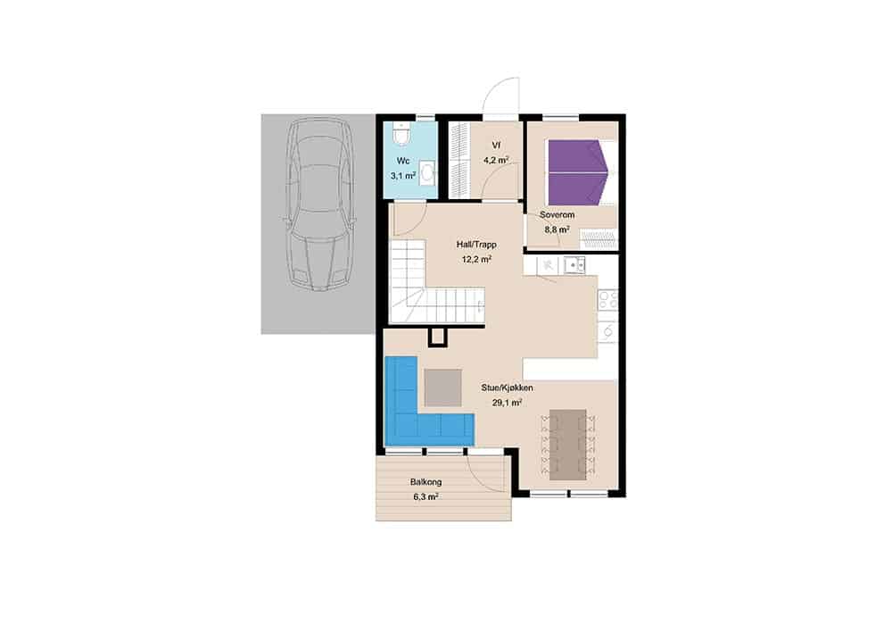 Med smarte bo-detaljer forener HEGG et tiltalende ytre med arealeffektive planløsninger. I hovedetasjen er det en romslig entré, wc, stort soverom og en åpen kjøkken-stue løsning i vinkel med god plass både til stort spisebord og sittegrupper. I underetasjen finner du et deilig, stort hjørnebad. Med carporten like utenfor hovedinngangen er det kort vei til bilen på hustrige vinterdager.