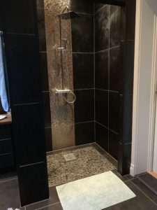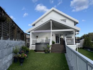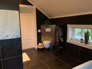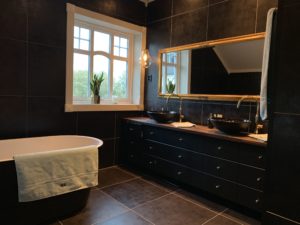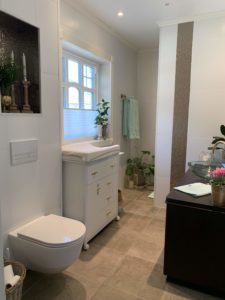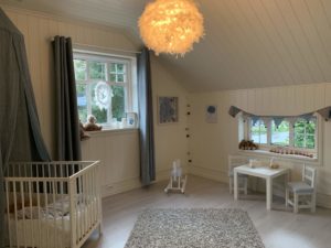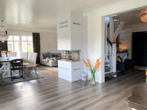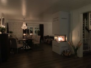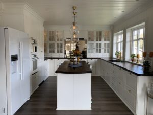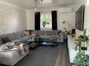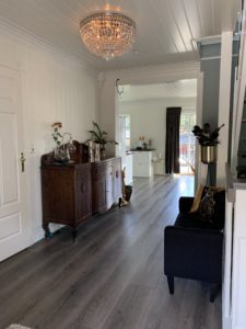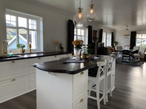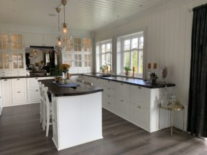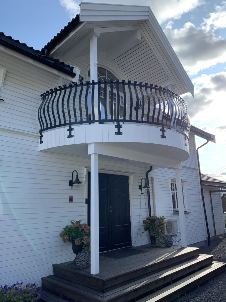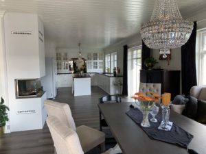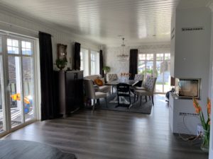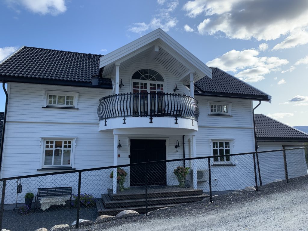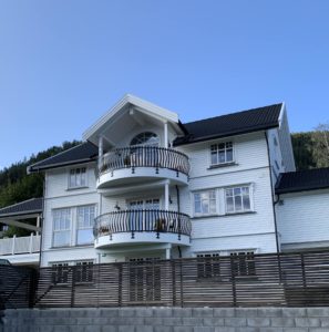 På Solbergmoen, utenfor Drammen er det bygget en stor enebolig med utleiedel. Boligen går over tre etasjer. 1. etg har stort kjøkken med åpen løsning mot spisestue og stue. Samt stort bad. I 2. etg finnes tre soverom, stort bad og romslig TV-stue med åpen himling. Boligens vaskerom og hobbyrom ligger i underetasjen med egen utgang til hage. Leiligheten i underetasjen har åpen løsning på kjøkken /stue, samt to soverom og bad. Boligen har tilknyttet dobbelgarasje. Under garasjen er det full størrelse bod/verksted. Boligen har tre balkonger og stor terrasse. Boligen er levert med elementer fra fabrikken Husvik SIA