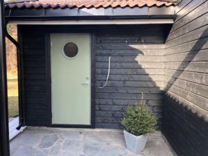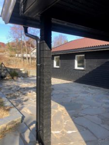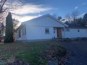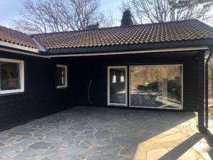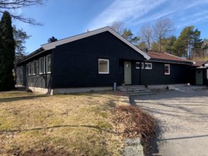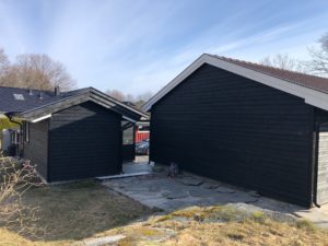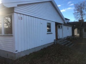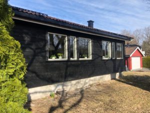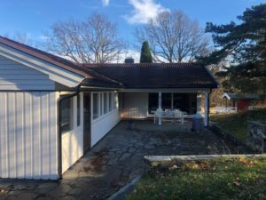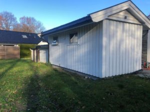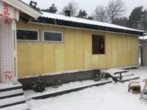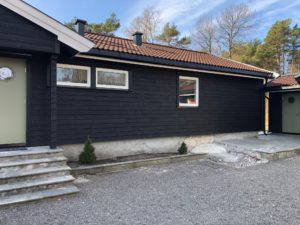 Enebolig med anneks har fått fjernet gammel panel. Det er isolert med 2 x 5 cm isolasjon, montert vindsperre, skiftet vinduer og kledning.