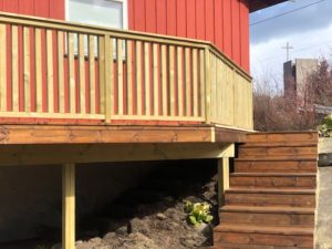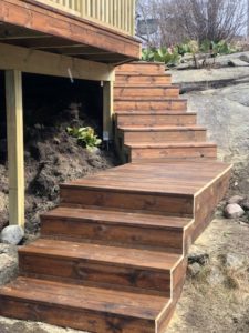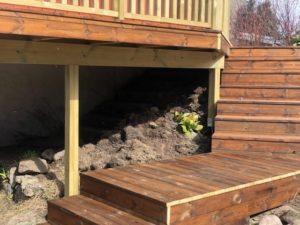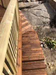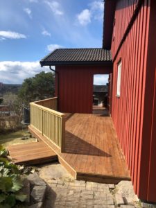 Stor flott veranda ble bygget med trapp som fører til hagen på nedstiden.
